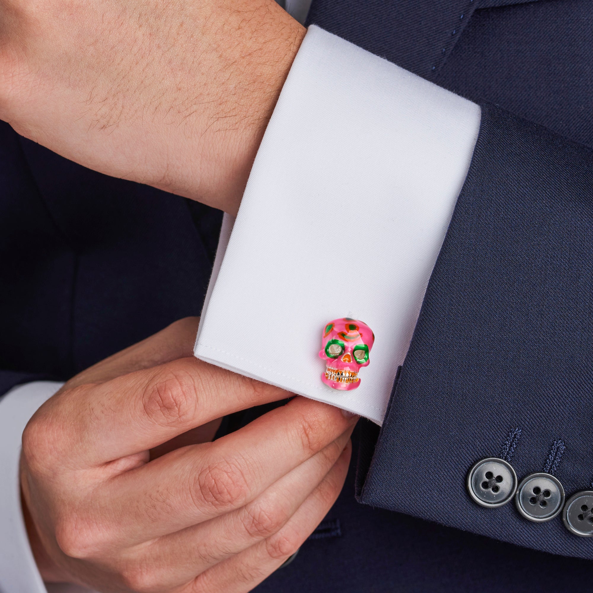 Sterling Silver Pink and Green 'Day of the Dead' Skull Cufflinks