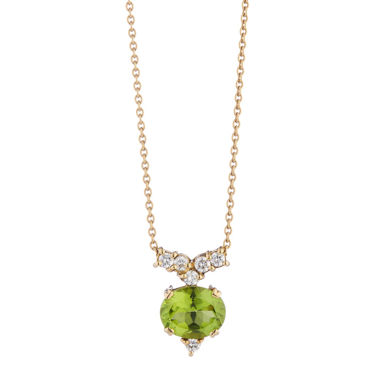 18ct gold peridot and diamond pendant, comprising of one central oval peridot gemstone and 6 diamonds.