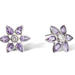 18ct white gold earrings featuring a central brilliant cut diamond and 6 pear shaped amethyst surround.