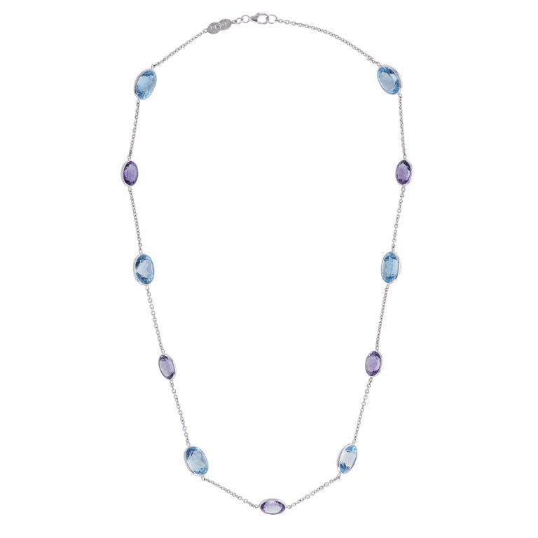 18ct white gold blue topaz and amethyst necklace comprising of six oval blue topaz gemstones and five oval amethyst gemstones.