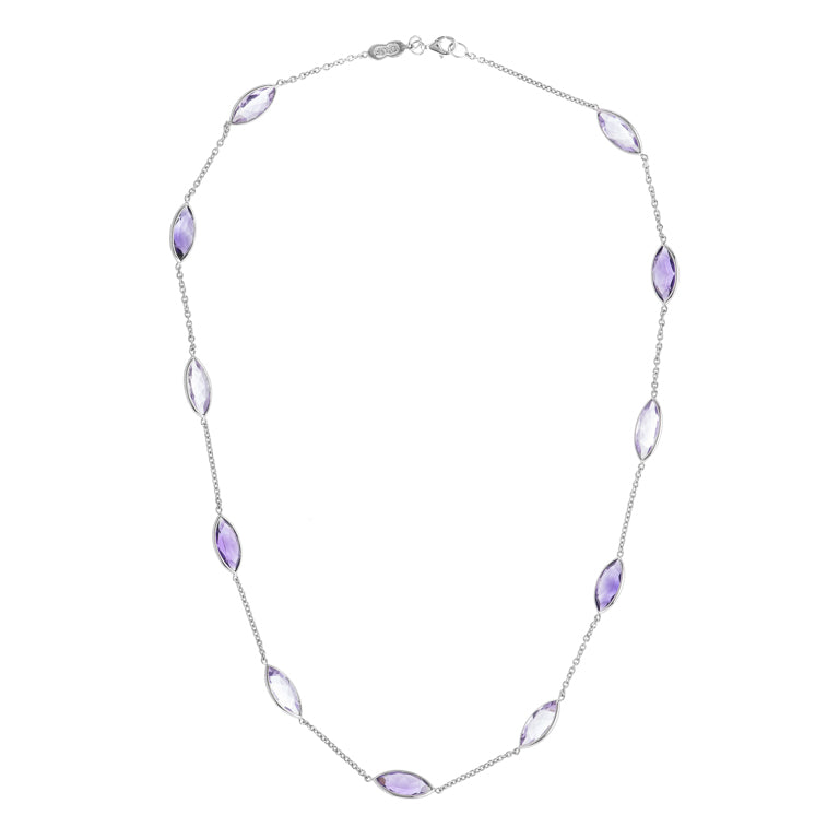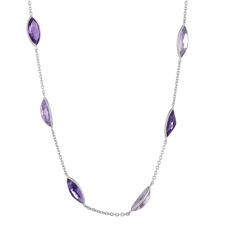 18ct white gold light and dark amethyst necklace comprising of eleven alternating light and dark marquise shaped amethysts.