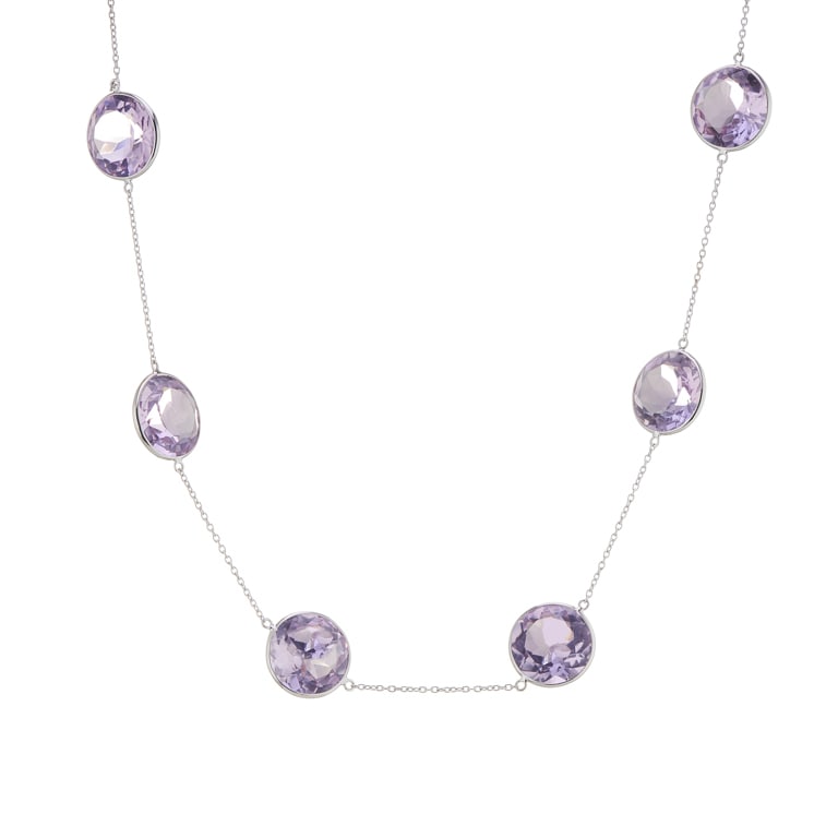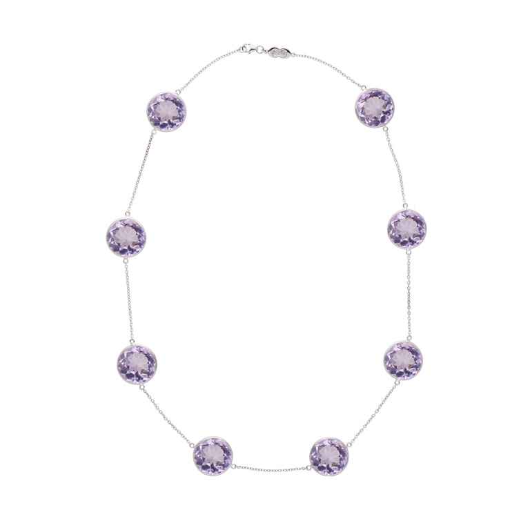 18ct white gold 20inch amethyst necklace showcasing eight pale purple amethyst gemstones.