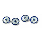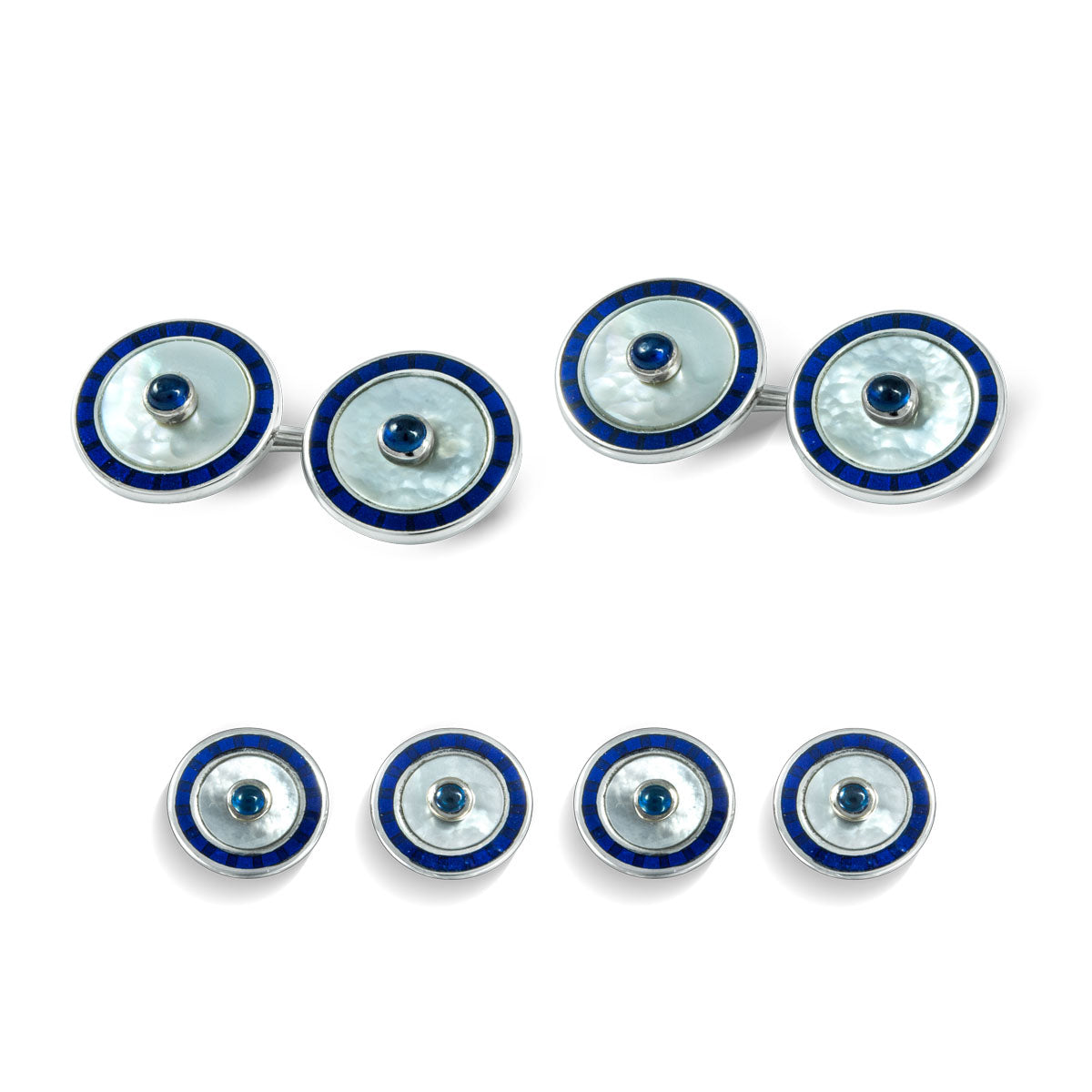 18ct white gold dress stud set featuring a hand painted enamel border, mother of pearl and sapphire.