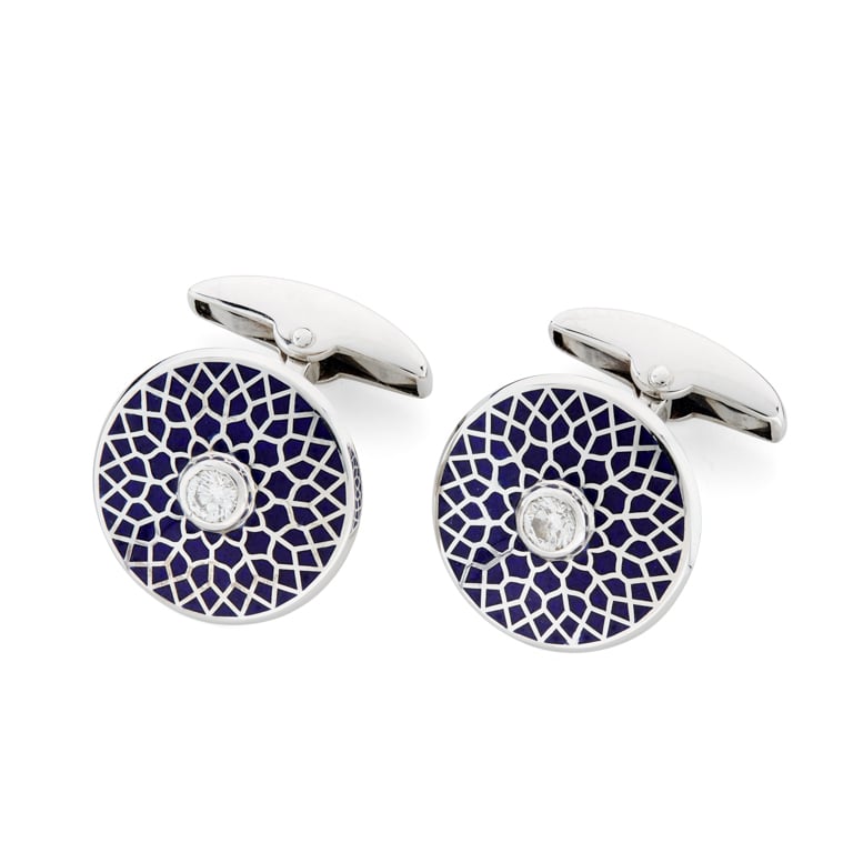 18ct white gold cufflinks with a hand-enamelled, navy blue pattern finished off with a diamond centre.