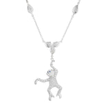 18ct white gold swinging monkey necklace set with diamonds and complete with blue sapphire eyes.