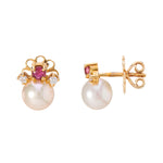 18ct yellow gold stud earrings featuring cultured pearls with ruby and diamond details.