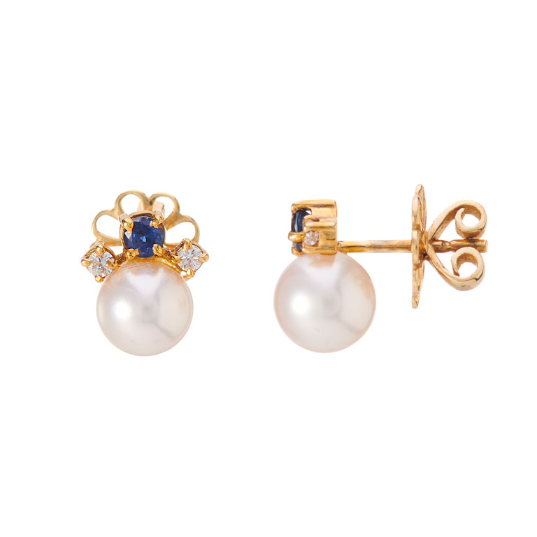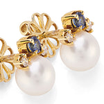 18ct yellow gold stud earrings featuring cultured pearls with sapphire and diamond details.