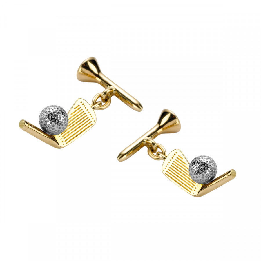 18ct yellow gold cufflinks featuring an intricate golf club, golf tee and dimpled ball design.