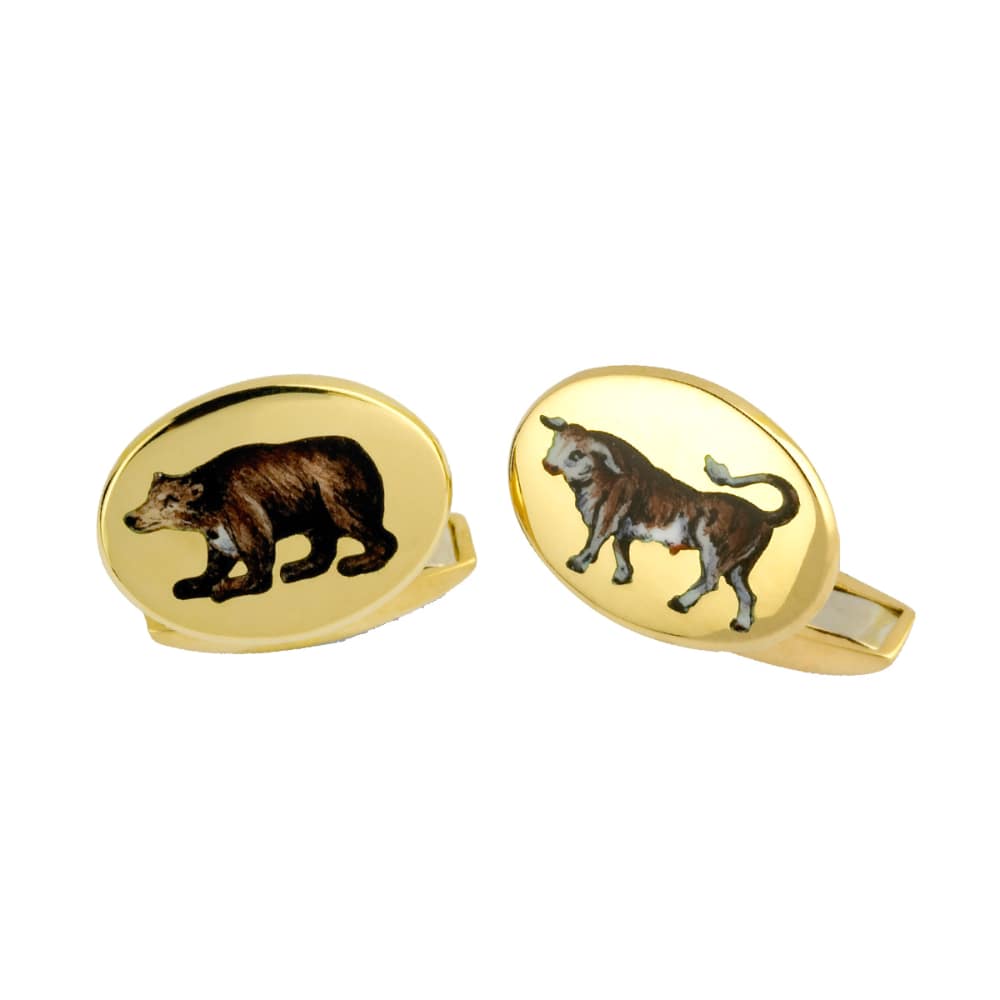 18ct yellow gold oval shaped cufflinks hand-enamelled with a bull and a bear design.