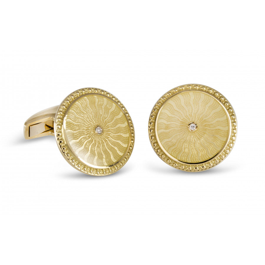 18ct Yellow Gold Round Cufflinks with Clear Enamel & Diamond Centre