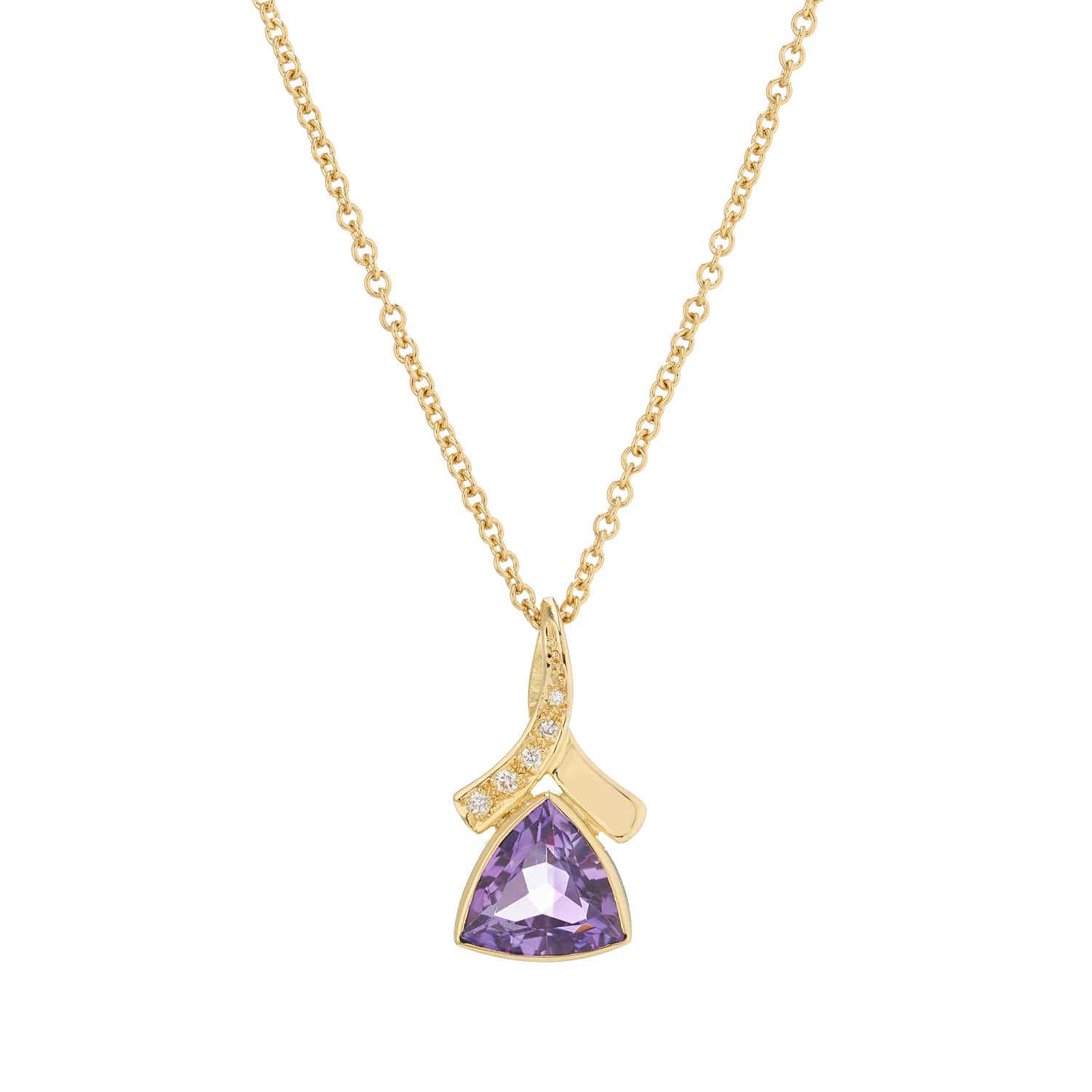 18ct yellow gold pendant featuring a purple trilliant cut amethyst with diamond detailing. This pendant comes complete with an 18ct yellow gold 18 inch trace chain.
