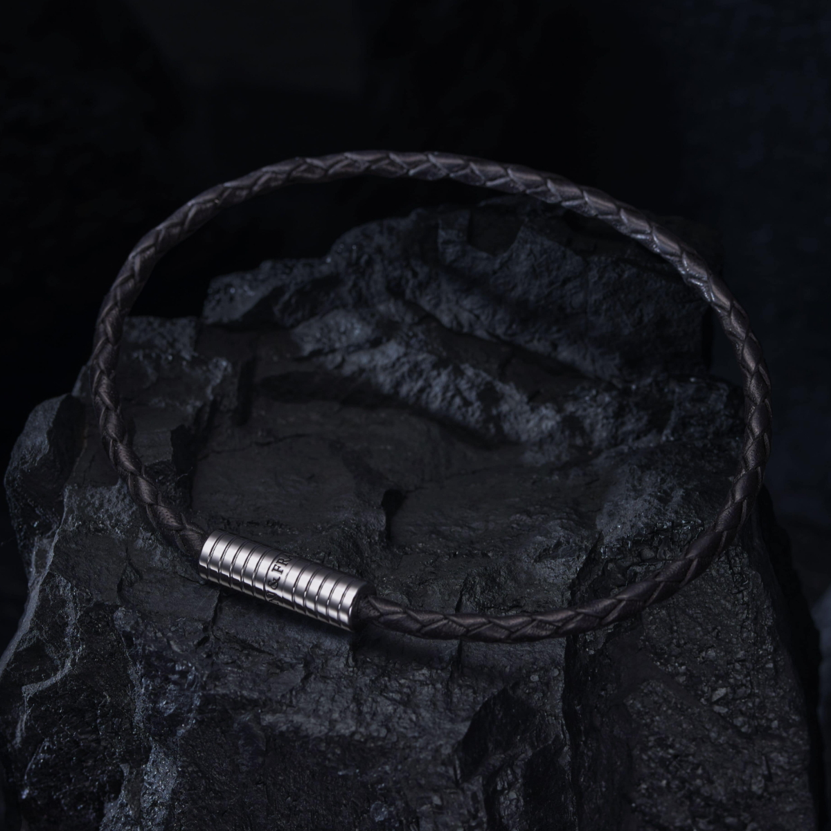 Black sapphire leather bracelet secured by a silver coloured magnetic clasp.