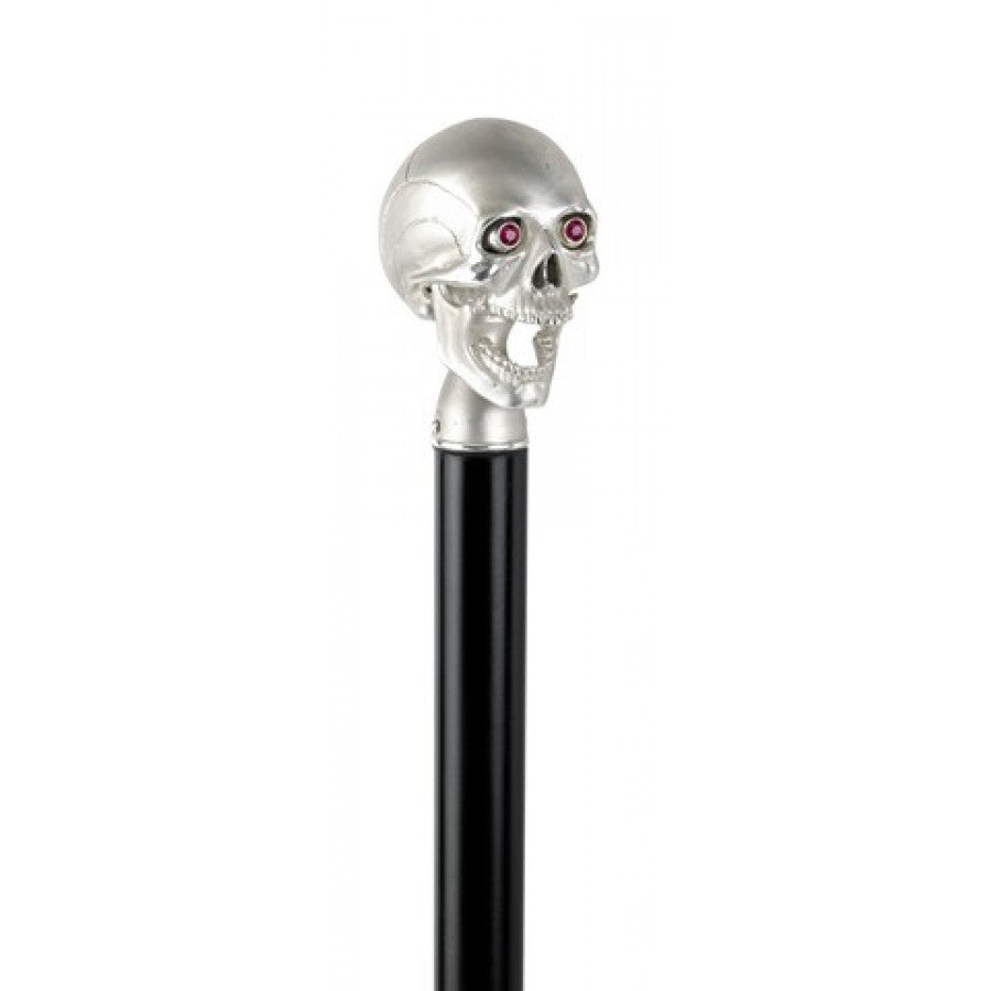 Skull handle walking stick approximately 36 inches long and crafted from beechwood that has been ebonised in a black finish topped with a rhodium plated skull head.