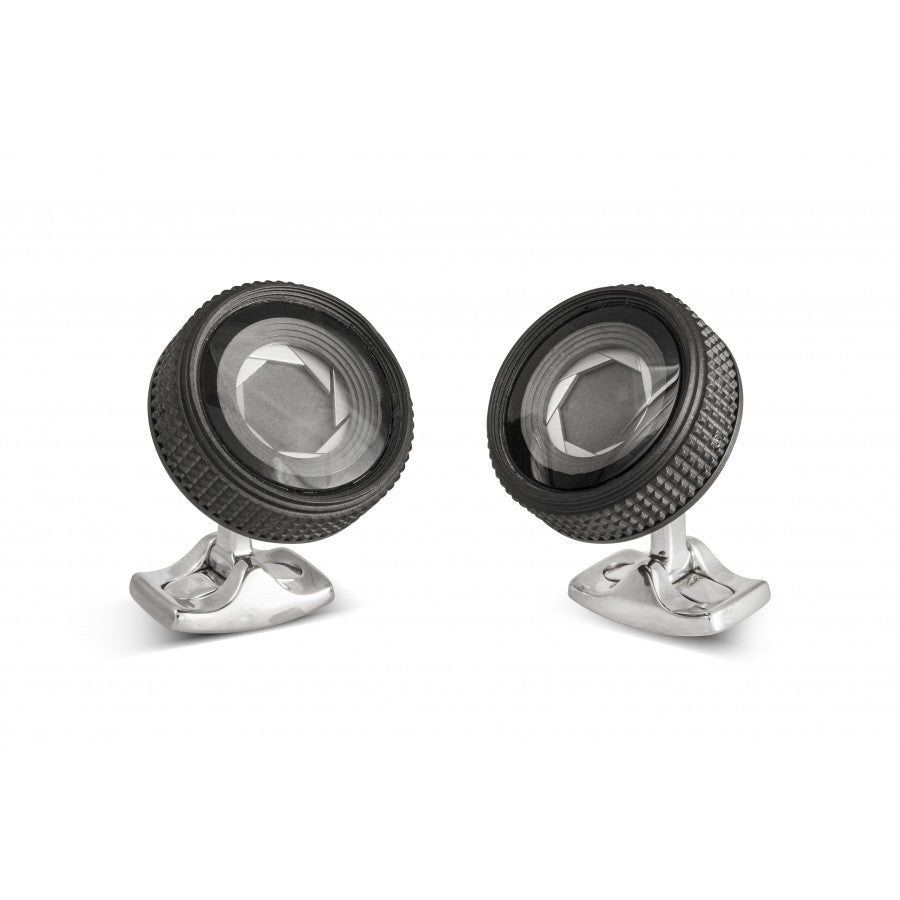 Round camera lens cufflinks with black outer rim. Twist the outer rim to see the camera lens open and close.