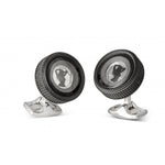 Camera lens cufflinks with glamorous lady, twist the black outer rim and watch the camera lens open to reveal the silhouette of a woman.