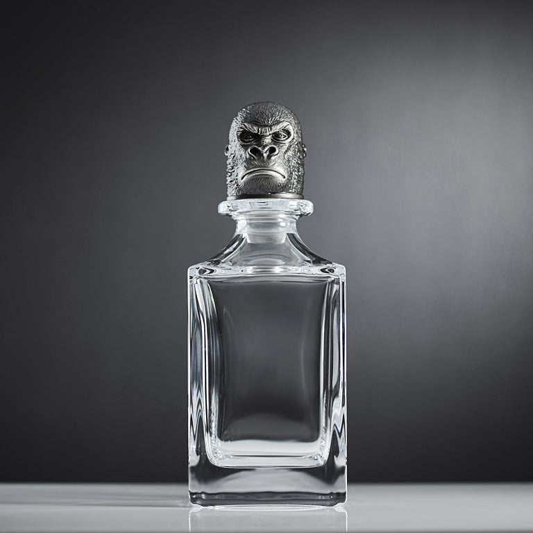 The decanters holds 65cl and is paired with our grumpy gorilla head, with an oxidised finish. Manufactured in a traditional crystal glass square spirit style by Dartington.