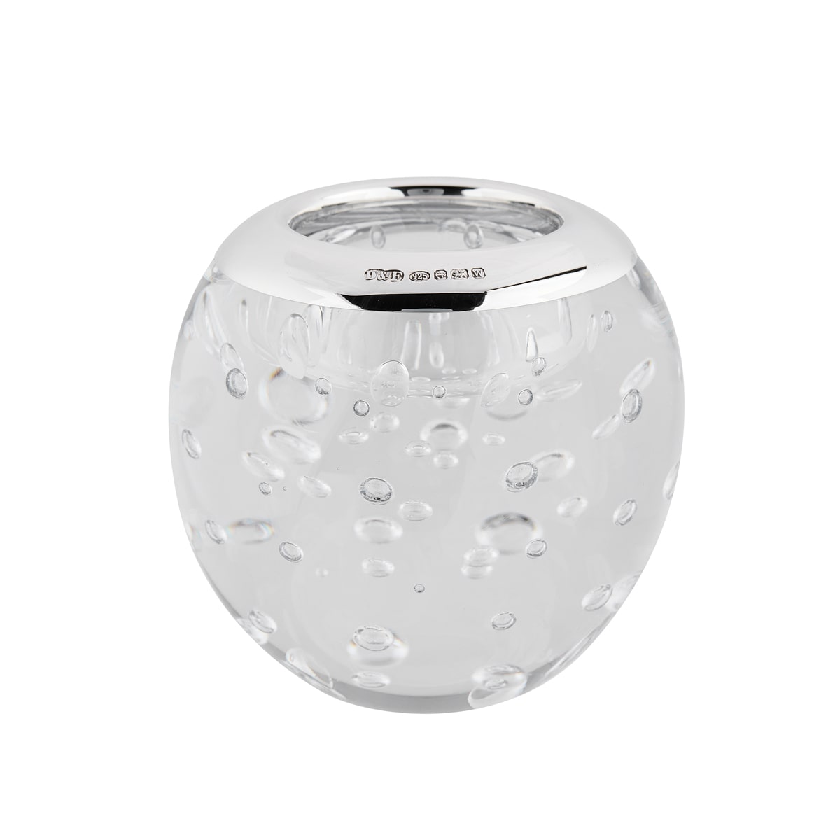 This unique bubble glass, sterling silver tealight holder is the perfect addition to the home. Featuring a sterling silver rim, this silver tealight holder is great for cosy nights in or dinner parties.