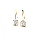 Delicate and dainty, this pair of earrings encase semi-precious white topaz gemstones in a gold plated, cushion setting. Perfectly complemented by the gold setting, the icy white colour is everlasting and is said to help the wearer clarify their thoughts and enhance creativity. The perfect gift for yourself or a loved one.