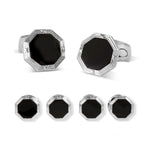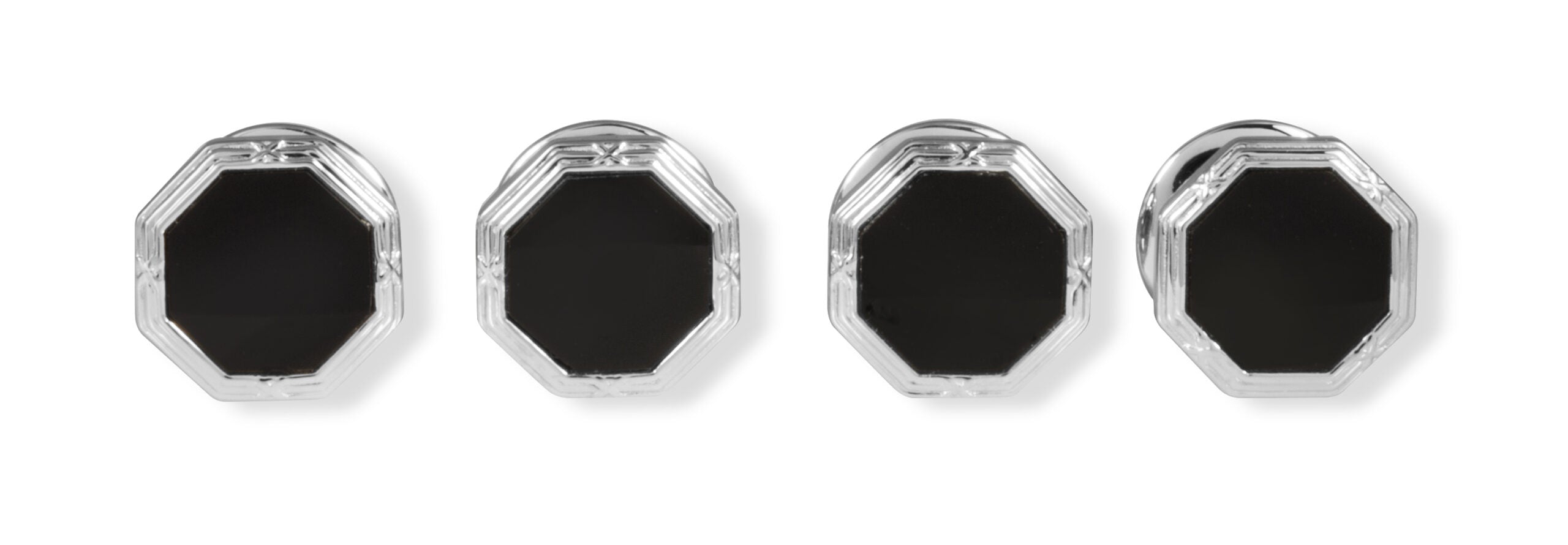 Fashionably retro, the hexagonal shape and the reed and ribbon border of these detailed cufflinks is perfect if you are looking for a sophisticated look with a touch of vintage with matching dress studs for those formal occasions.
