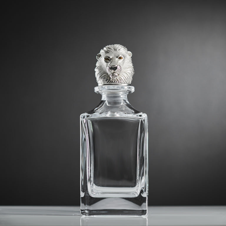 Our proud lion statement ring has transformed into a daring crystal port decanter!Our beautiful are extra special. Manufactured in a traditional square spirit style by Dartington. Once the decanters are delivered to Deakin & Francis, we pair with one of our stunning stoppers which are designed in our factory, in Birmingham s historic Jewellery Quarter. The decanters hold 65cl.This decanter is finished with our proud lion head, designed and manufactured by Deakin & Francis. This show-stopper comes in a sleek silver finish. The perfect home bar accessory!
