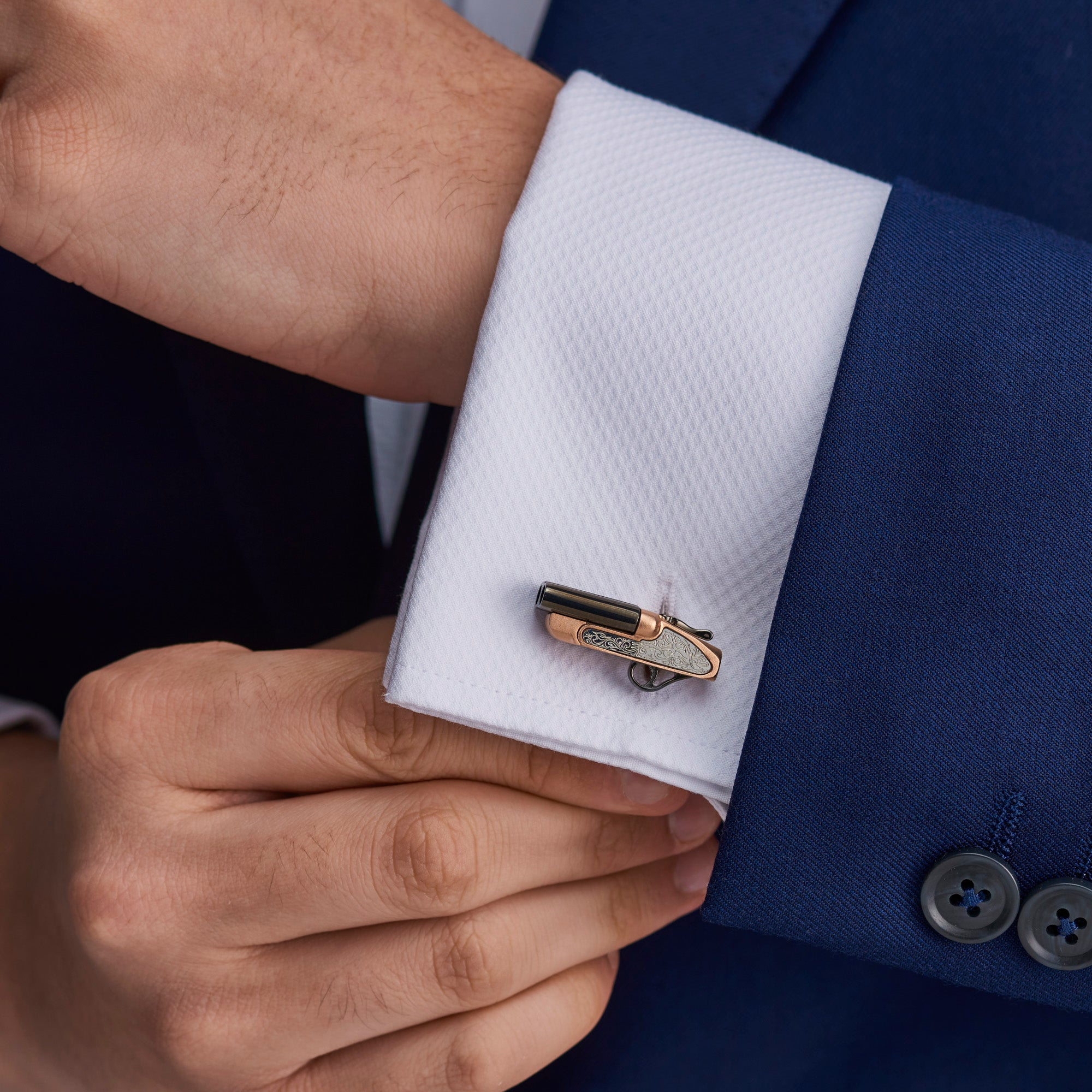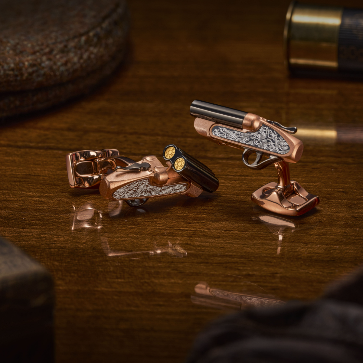 Rose gold plated shotgun cufflinks with black rhodium barrels and intricate side engraving.