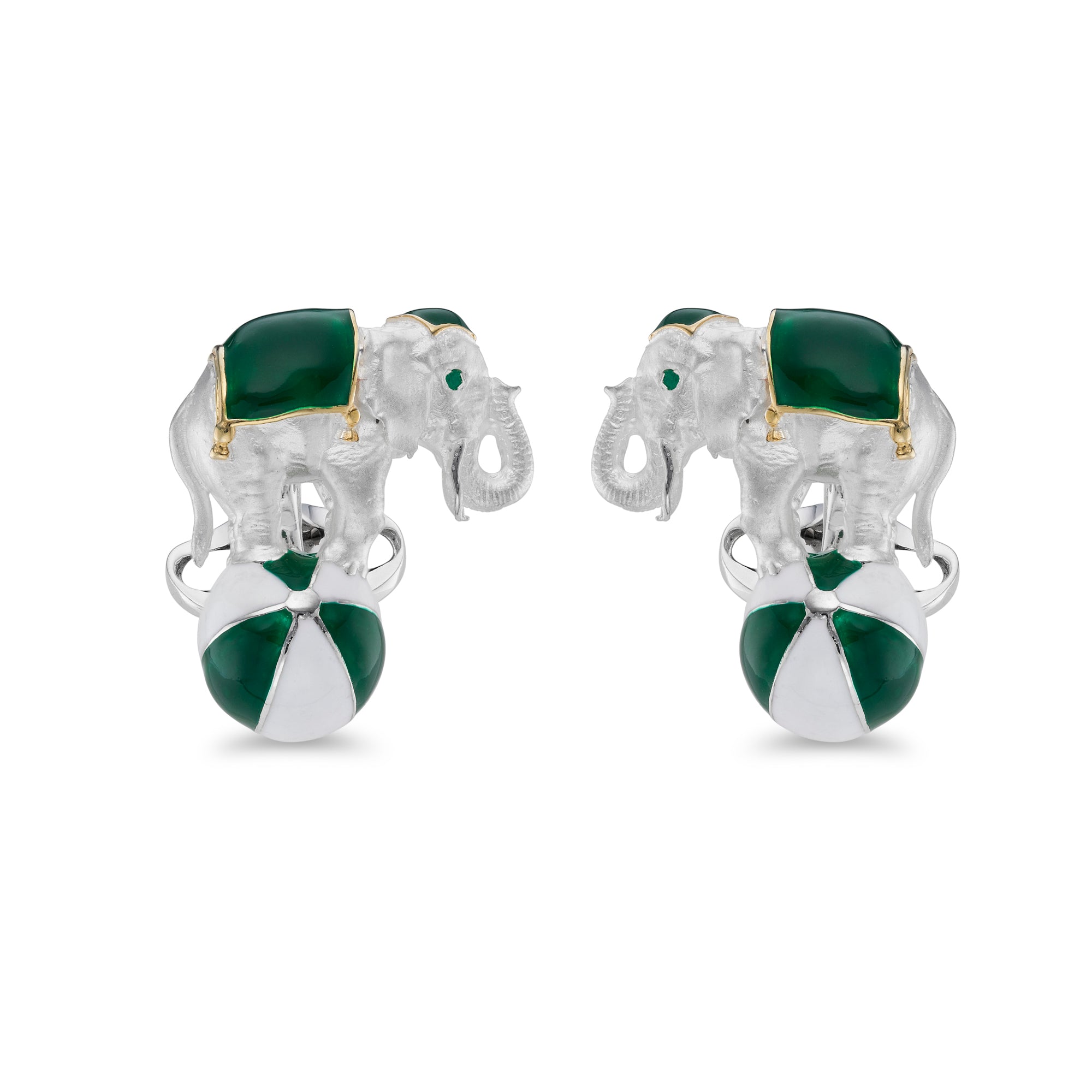 Sterling Silver Elephant On A Ball Cufflinks - Green. Emerald Eyes.