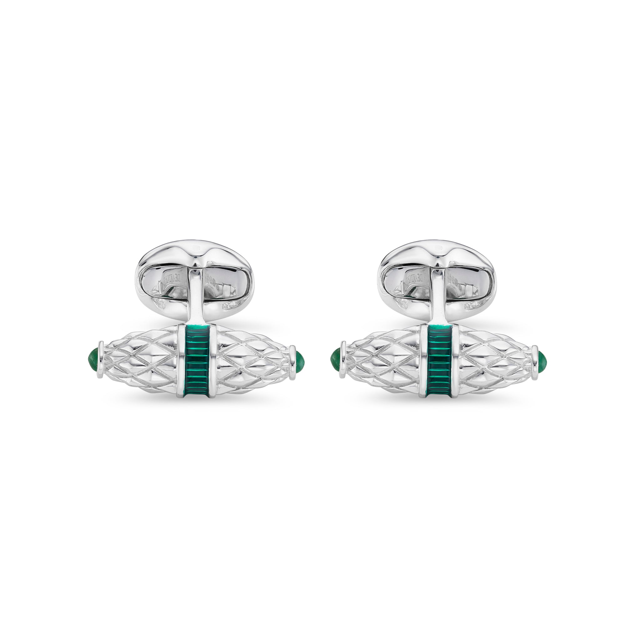 Sterling Silver Fancy Bar Cufflinks With Green Enamel Centre and Emerald Ends
