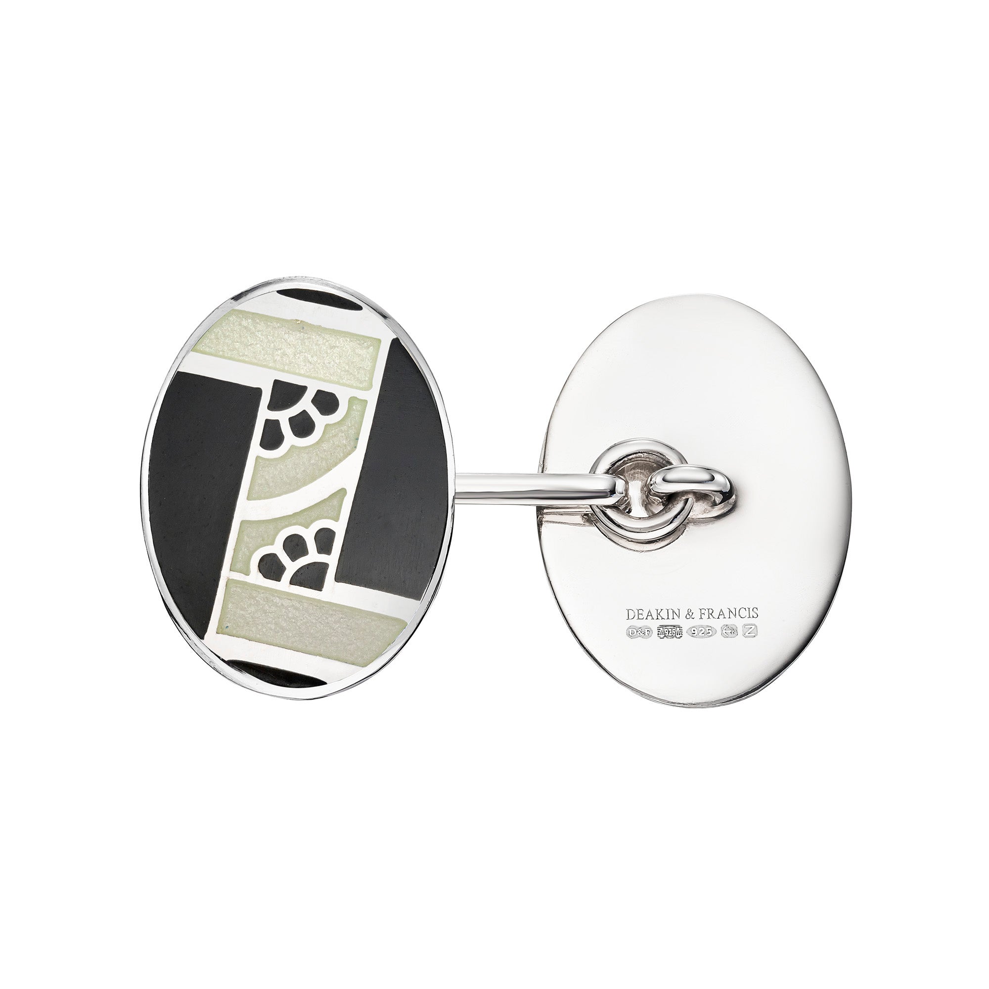 These classic cufflinks are crafted from sterling silver and feature an intricate enamelled rectangular decorative design. Designed as an homage to the vibrancy of the Art Deco era these cufflinks capture the energy, glamour and excitement of the jazz age with effortless elegance.