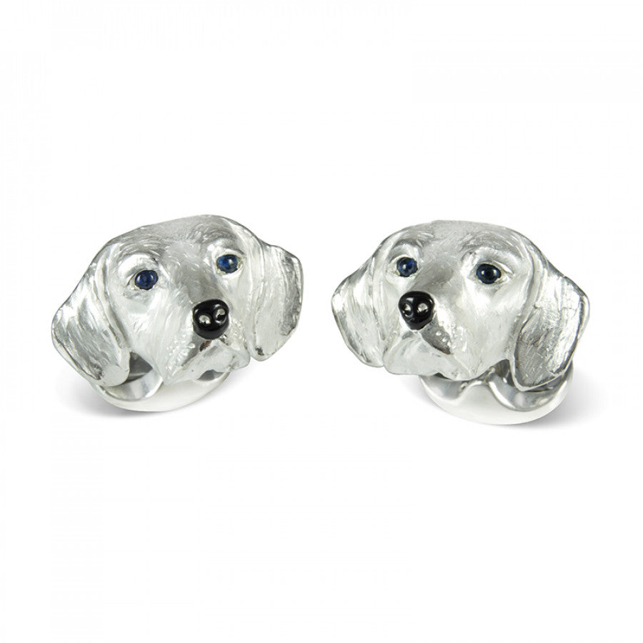 With superior tracking instincts, the Beagle dog is famed for their hunting and detection techniques. Playful in nature, these popular pets will look perfect sniffing out trouble on your shirt cuff, the perfect companions! Crafted from sterling silver, these cufflinks feature sparkling blue cabochon sapphire eyes, floppy ears and a cute button nose.