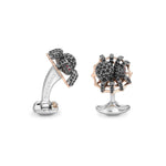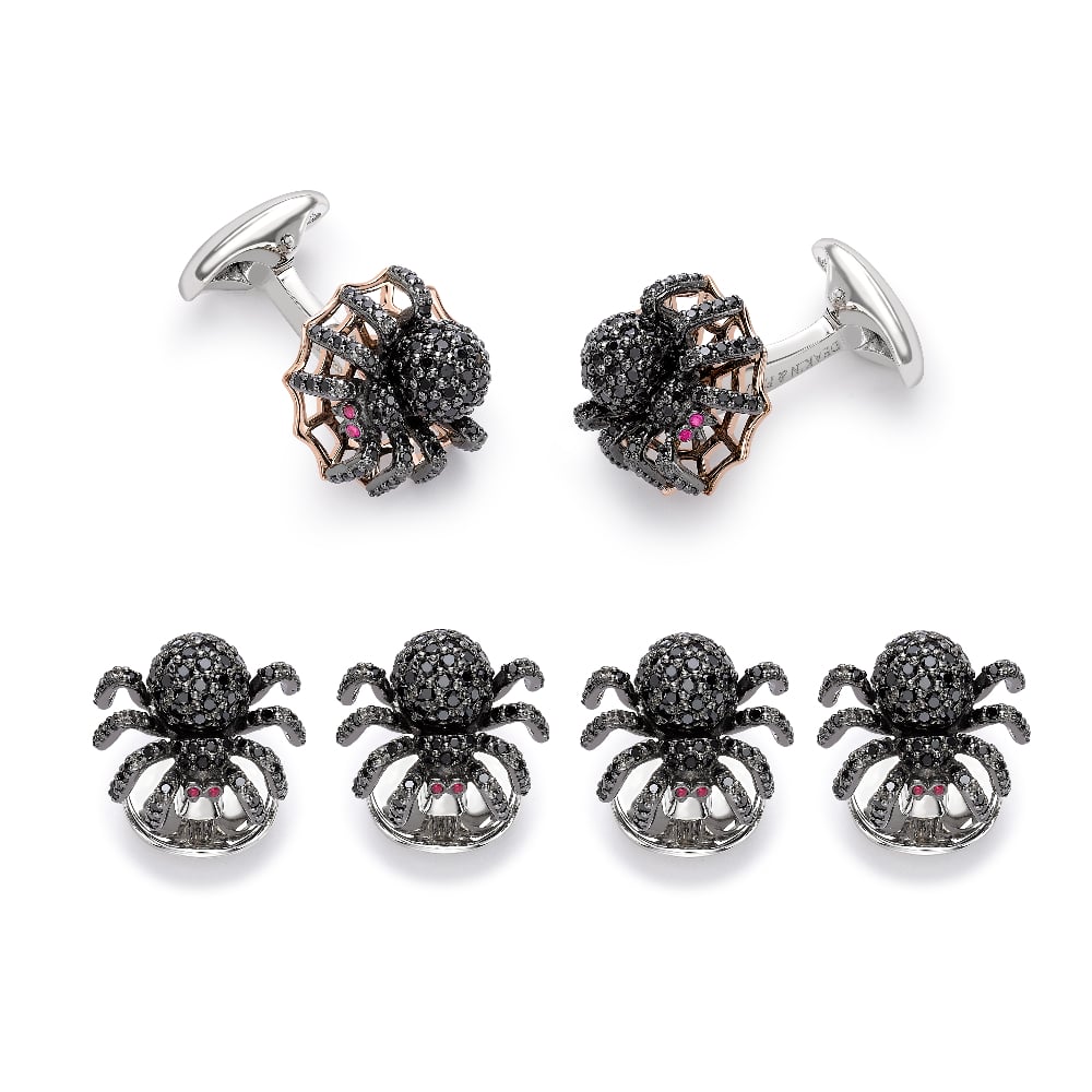 Stunningly creepy, these sterling silver spider cufflinks and dress studs are sure to send shivers up your shirt! These sterling silver spiders are encrusted in semi-precious black spinel stones, with ruby eyes and the cufflinks feature a contrasting rose gold plated web . With a dark, edgy twist, let these uber-cool spiders spin their web on your shirt sleeves! The full dress stud set contains four dress studs and a pair of matching cufflinks. The full dress stud set comes complete with a full set of Deakin & Francis hallmarks for authenticity and comes beautifully packaged.
