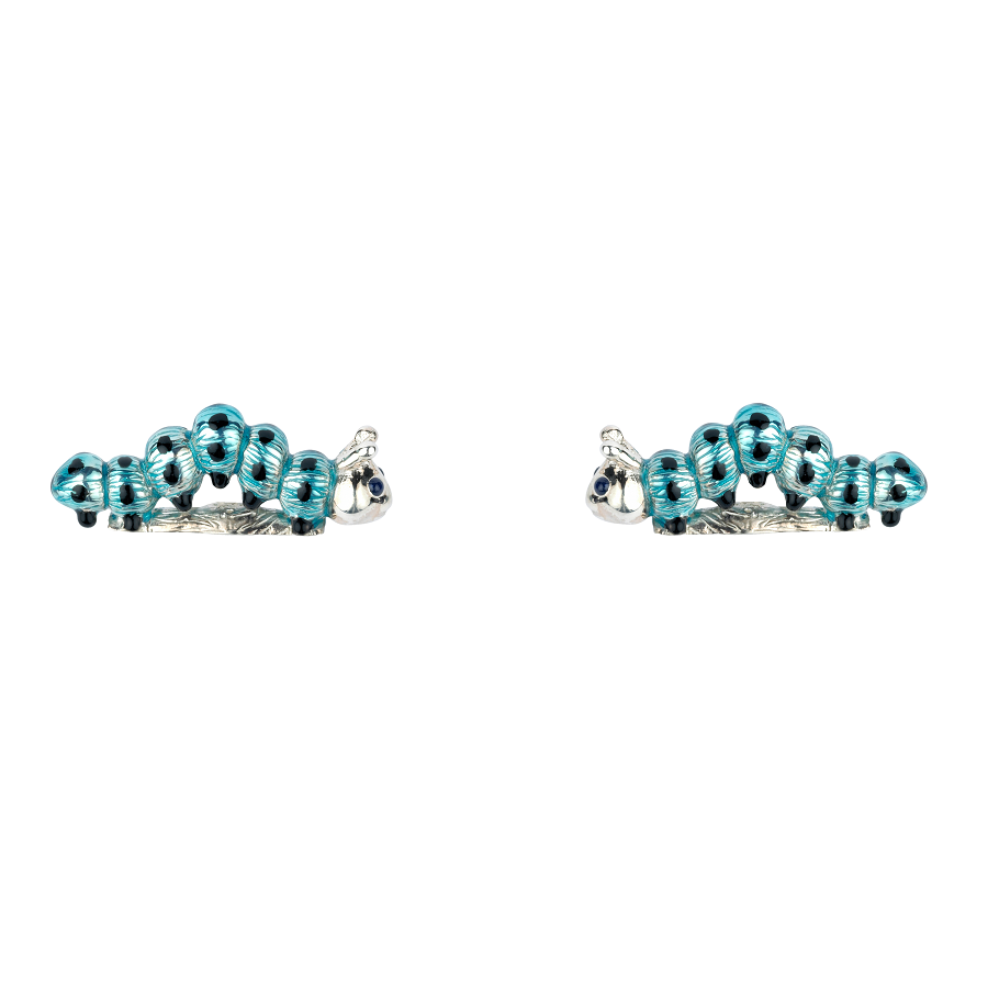 These Sterling Silver Caterpillar Cufflinks will wriggle along your cuff keeping you company all day! With cabochon sapphire eyes and finished in a vibrant blue and black enamel, these friendly critters have a small domed oval spring link fitting to keep them crawling along your cuff.