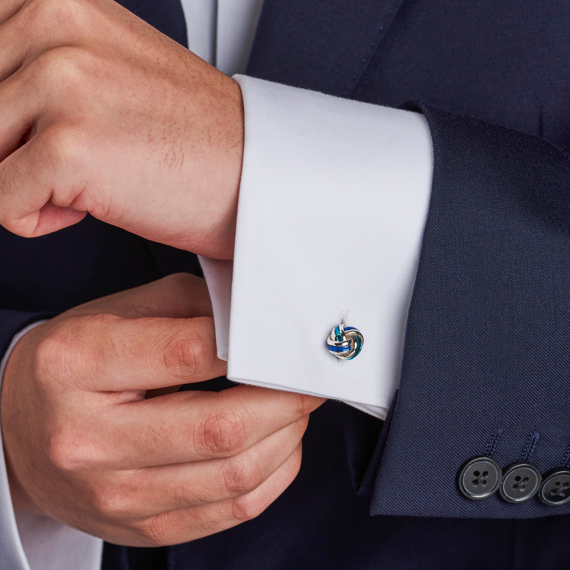 Don't get yourself in knots - choose this striking sterling silver knot dress stud set! For the ultimate finishing touch or perfect celebration gift, each dress stud and matching cufflinks have been hand-enamelled in a mix of royal blue and denim blue to make them really stand out. The set contains four dress studs and matching cufflinks. The full dress stud set comes complete with a full set of Deakin & Francis hallmarks for authenticity and comes beautifully packaged.