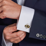 A familiar feature of the English countryside garden, the bumblebee s bright colours was the inspiration behind this fantastic set of bumblebee cufflinks. The vibrant black and yellow enamel detail combined with the brilliantly set cabochon sapphire eyes make these bumblebee cufflinks the perfect accessory to create a buzz around any outfit. Aside from these bee cufflinks, the full bumblebee dress stud set is also available, along with a wide variety of other animal cufflinks.