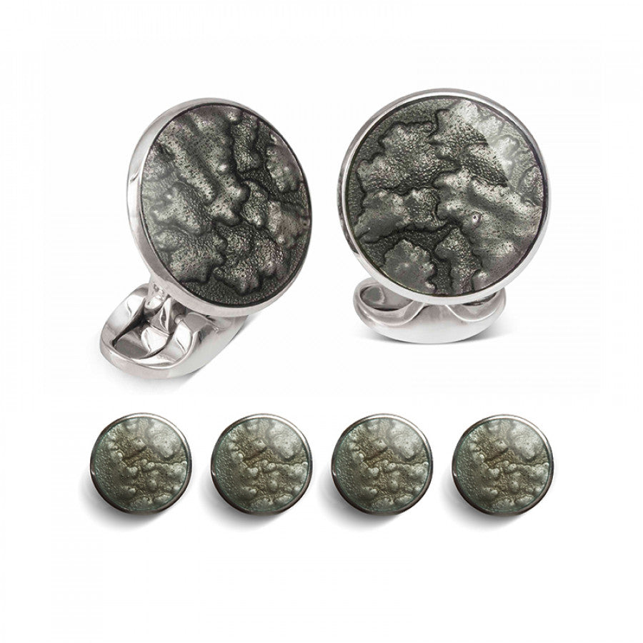 Capturing the hazy skies of the beautiful British landscapes our hazy collection is inspired by the colour palette of the quintessentially British seasons. With inspiration taken from John Constables 1822 'Cloud Study', the colours, movements and textures of a swirling English sky has been bought to life within this stunning, British made dress stud set. Beautifully hand-enamelled in a deep grey colour, the organic and natural lines allow the vitreous enamel to show off its density, texture, tone and brightness. And, just like a real summers sky, as the light changes on these cufflinks you will see different tones shimmer and shine. Entirely hand-made, the grey swirling pattern sits harmoniously within a classic, round sterling silver setting. The set contains a pair of cufflinks and four dress studs.