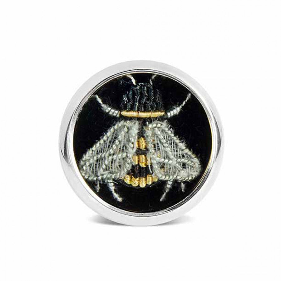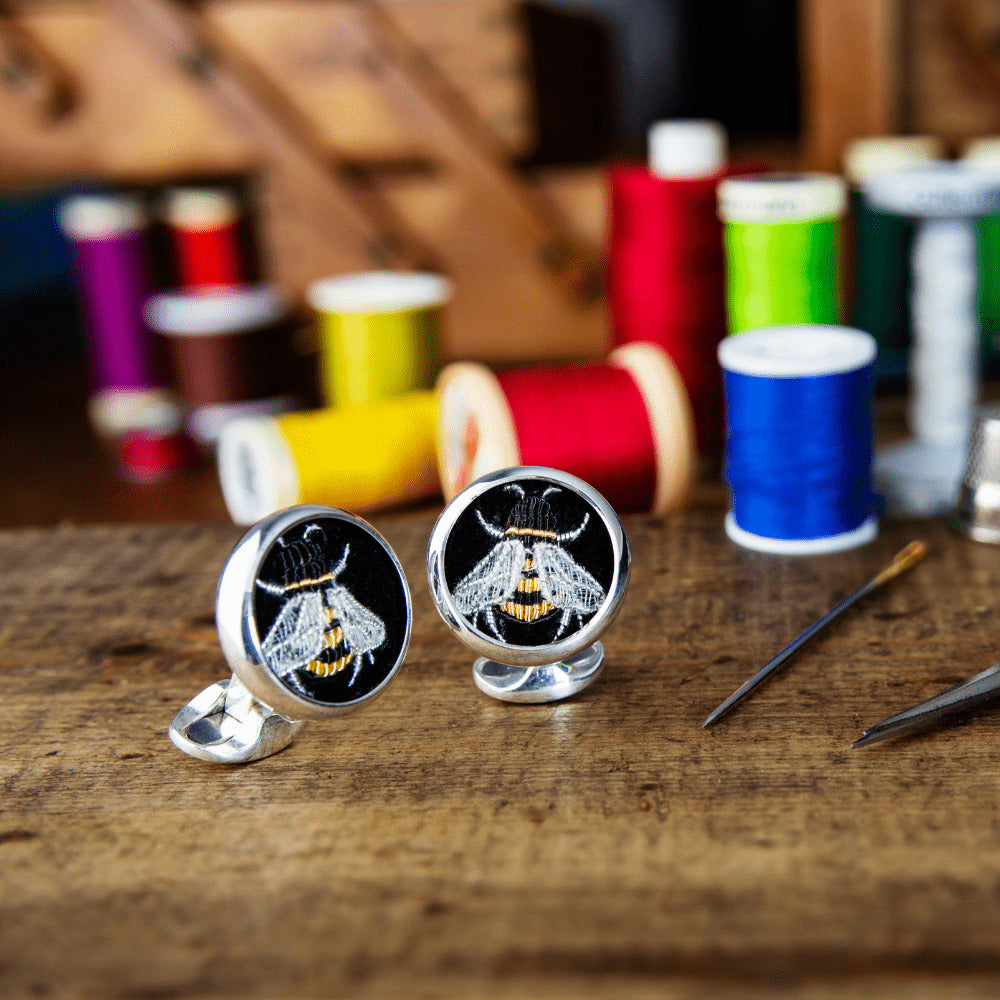 Cocooned in our hand spun sterling silver cups, this intricate bee design has been hand-stitched for us by London's premier embroidery house; providing embellishment services to the Royal Family, Royal Armed Forces, Saville Row and now Deakin & Francis.