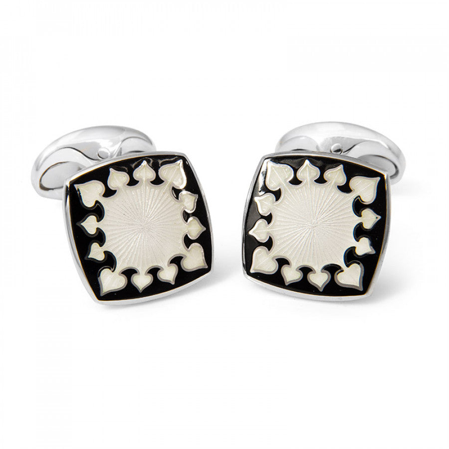 Hand-crafted from sterling silver, these cushion shaped cufflinks have been hand-enamelled in a striking, artistic pattern. With a fancy patterned rich black border and bright white centre, this pair are perfect for both daytime and evening attire.