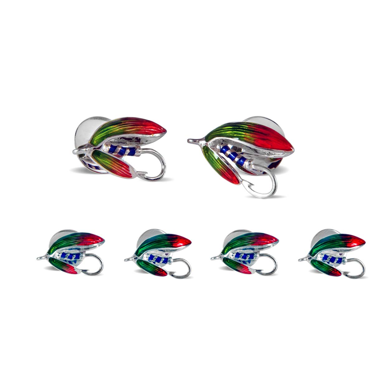 Hand-crafted from sterling silver, each dress stud and cufflink has been hand-enamelled in a beautiful, colourful finish and the complete set will brighten up your evening attire. Perfect for all keen fishermen!