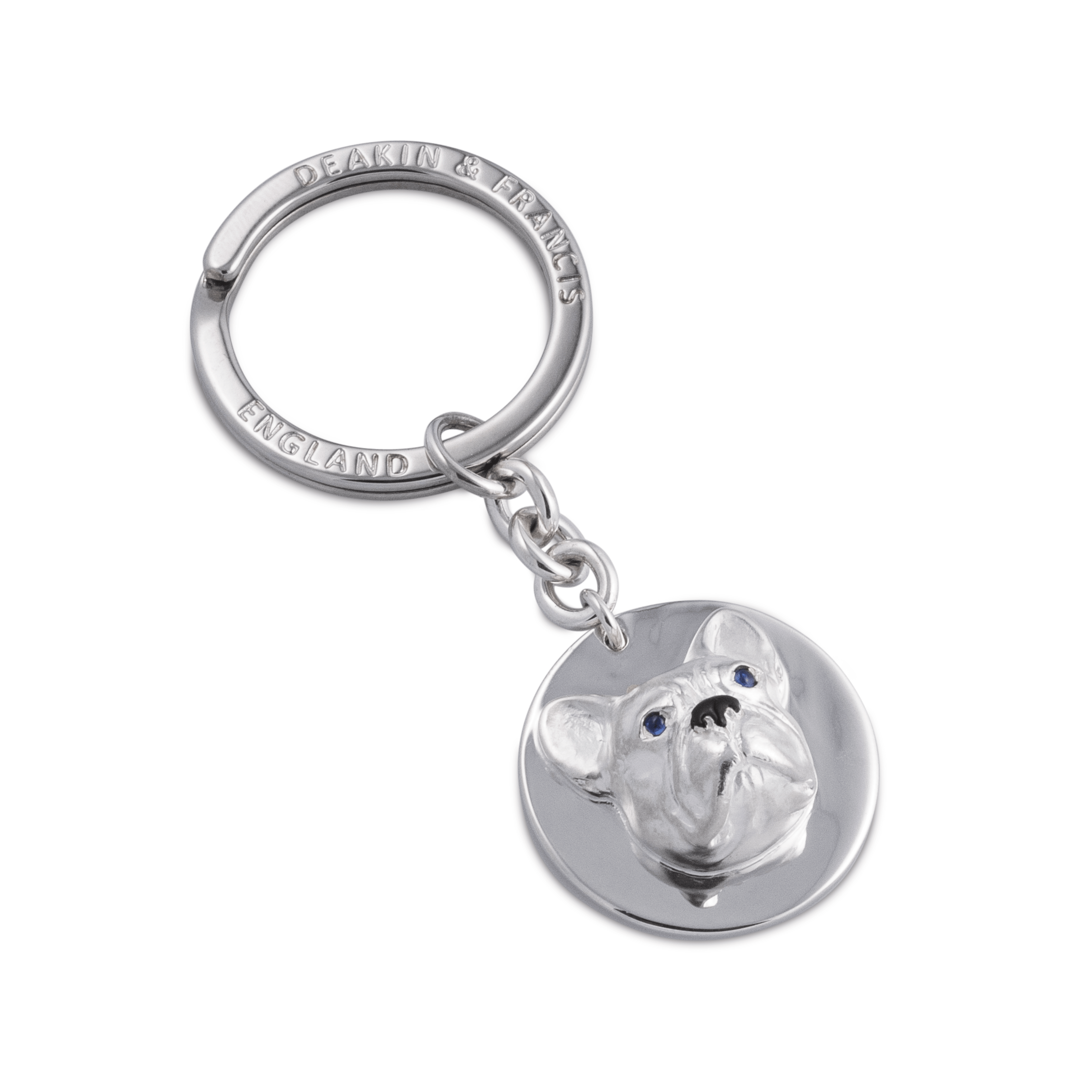 French Bulldogs, also known as Frenchies, are one of the most popular breeds of dog! This charming French bulldog keyring has been crafted from sterling silver and feature realistic wrinkles, deep blue cabochon sapphire eyes and a serious expression but don t be fooled! With a sweet disposition these lovable dogs will be more than happy to relax on your bunch of keys!