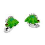 Brought back to life, these stunning sterling silver dinosaur cufflinks have been hand-enamelled in a bright green finish, with pale blue enamel spots and a cheery expression, these pre-historic creatures will bring your cuffs to life!