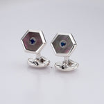 The stunning hexagonal shape of the sterling silver studs and cufflinks really make this set stand out and each piece features a hand-cut, grey mother-of-pearl inlay and beautiful sapphire centre.