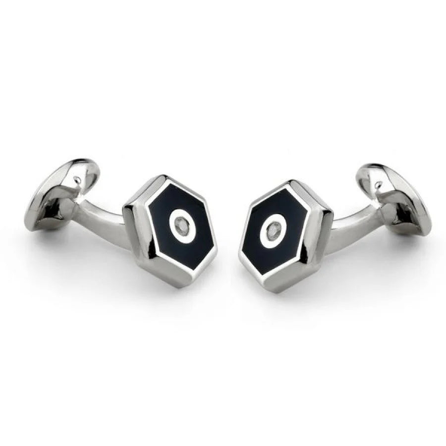 The stunning hexagonal shape of the sterling silver studs and cufflinks really make this set stand out and each piece features a hand-cut, black onyx inlay and beautiful diamond centres.
