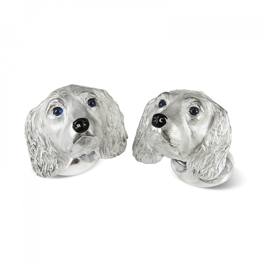 Crafted from sterling silver, these beautiful dog designs are fit for a king! With a playful nature, these stunning cufflinks feature their wavy long ears and petite faces and are finished off with deep blue cabochon sapphire eyes. With a sweet disposition these lovable dogs will be more than happy to relax on your shirt cuff and keep you company in style!