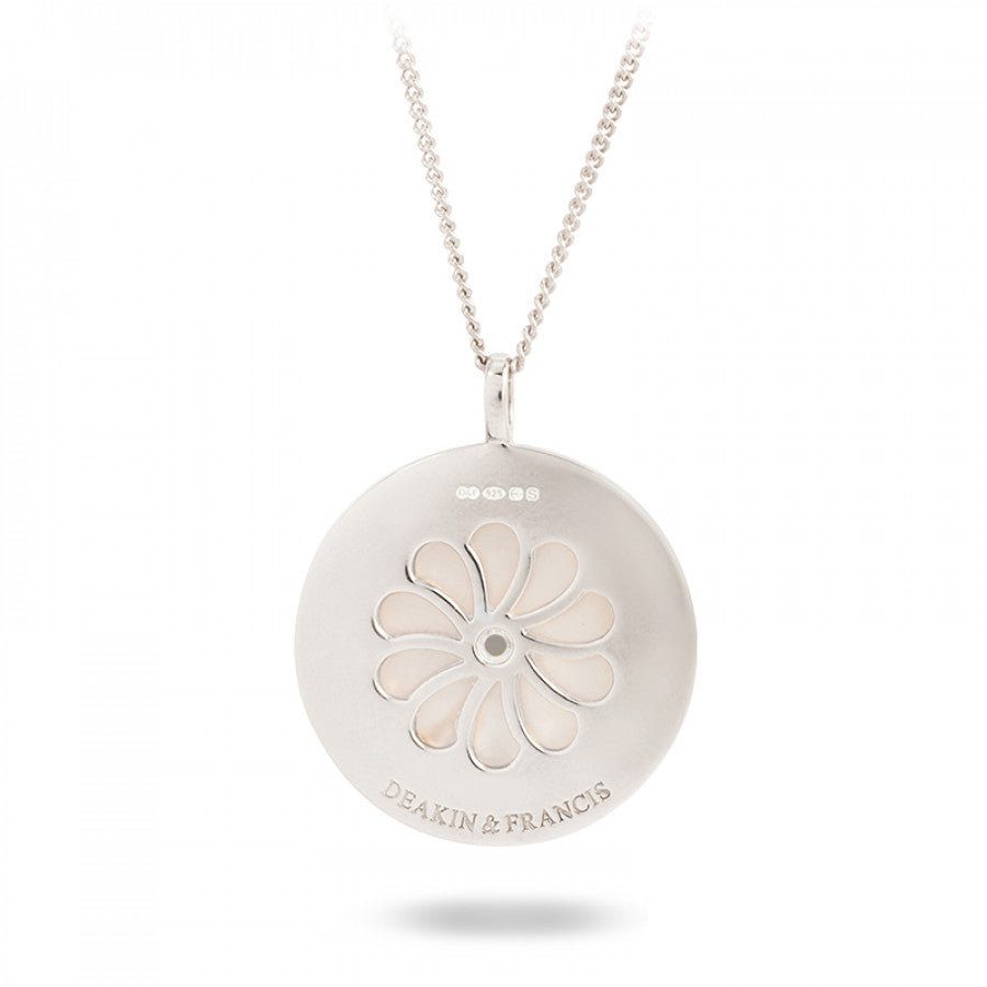 This stunning sterling silver pendant is the perfect, everlasting choice for the sophisticated woman. With its beautiful lustre of the grey mother-of-pearl inlay, this round design is beautifully finished with a blue sapphire gemstone centre.