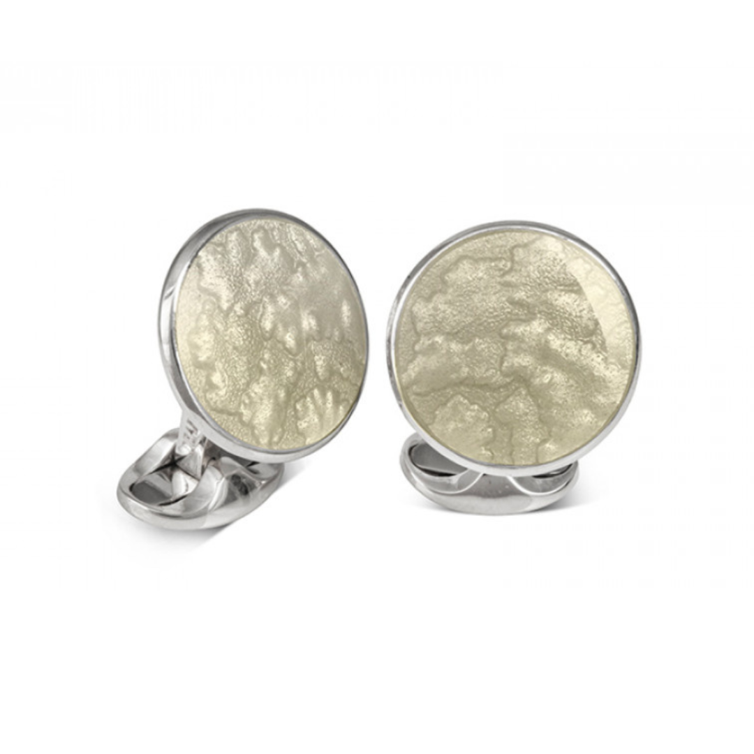 Capturing the hazy skies of the beautiful British landscapes our hazy collection is inspired by the colour palette of the quintessentially British seasons. With inspiration taken from John Constables 1822 'Cloud Study', the colours, movements and textures of a swirling English sky has been bought to life within this stunning, British made dress stud set. Beautifully hand-enamelled in a light grey colour, the organic and natural lines allow the vitreous enamel to show off its density, texture, tone and brightness. And, just like a real summers sky, as the light changes on these cufflinks you will see different tones shimmer and shine. Entirely hand-made, the grey swirling pattern sits harmoniously within a classic, round sterling silver setting. The set contains a pair of cufflinks and four dress studs.