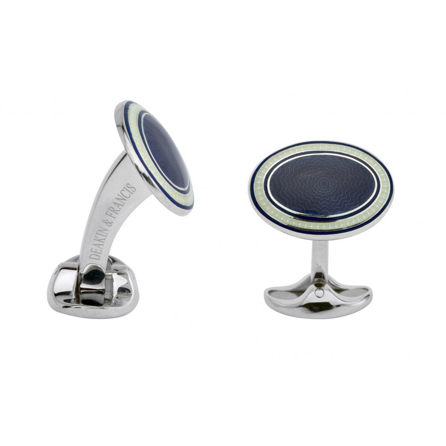 Here at Deakin & Francis we are masters in the art of vitreous enamelling, dating back to the Pharaohs, this is a highly specialised, hand skill. These sterling silver oval cufflinks have been hand-enamelled with an stunning navy blue, clear and purple design to give them an edgy, contemporary twist.