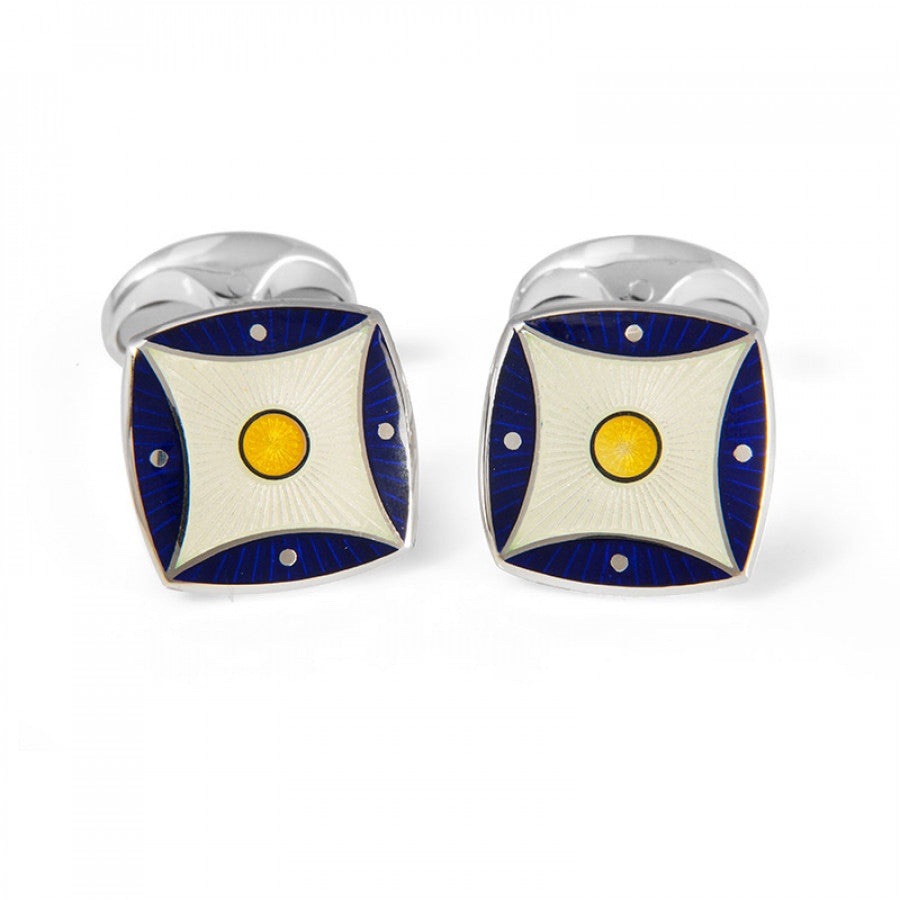 Made from Sterling Silver, these cushion shaped cufflinks have been hand-enamelled in a fancy pattern. With a rich navy blue border with subtle silver spots, this design features a clear inner and bright yellow splash of colour to the centre. This pair of cufflinks are ideal to take you from daytime to evening wear with style.