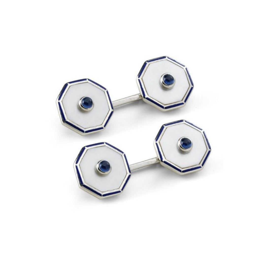 These sterling silver octagonal cufflinks have an intricate hand-enamelled navy blue border, white mother-of-pearl inlay and beautiful sapphire set centre, secured with a traditional fetter link chain. Total stone weight of 0.1ct.