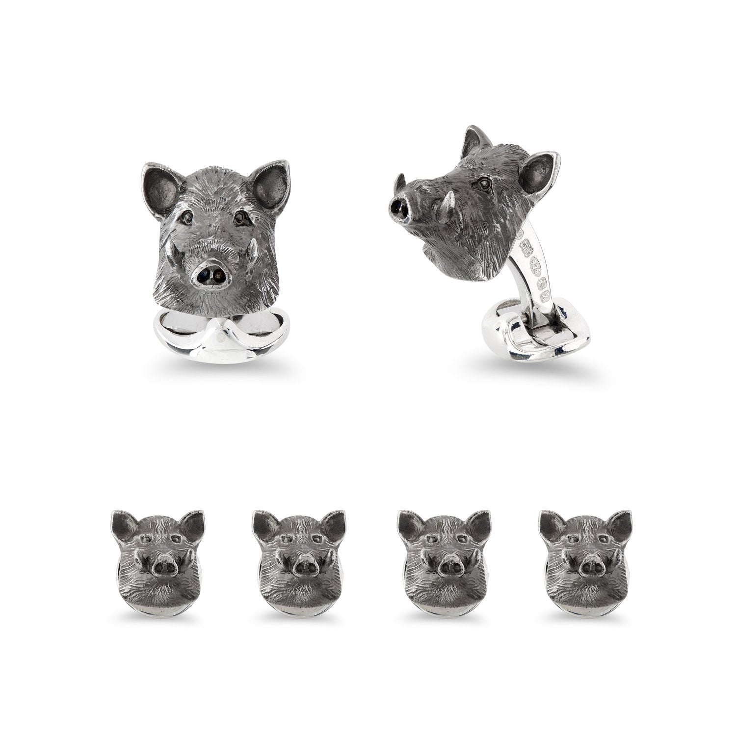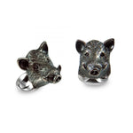 If you go down to the woods today you might find these striking, sterling silver boar head cufflinks and studs! Featuring intense eyes, a pointy snout and little horns, these fearsome boars have been oxidised for effect! There is nothing boar-ing about this dress set and is sure to turn heads.