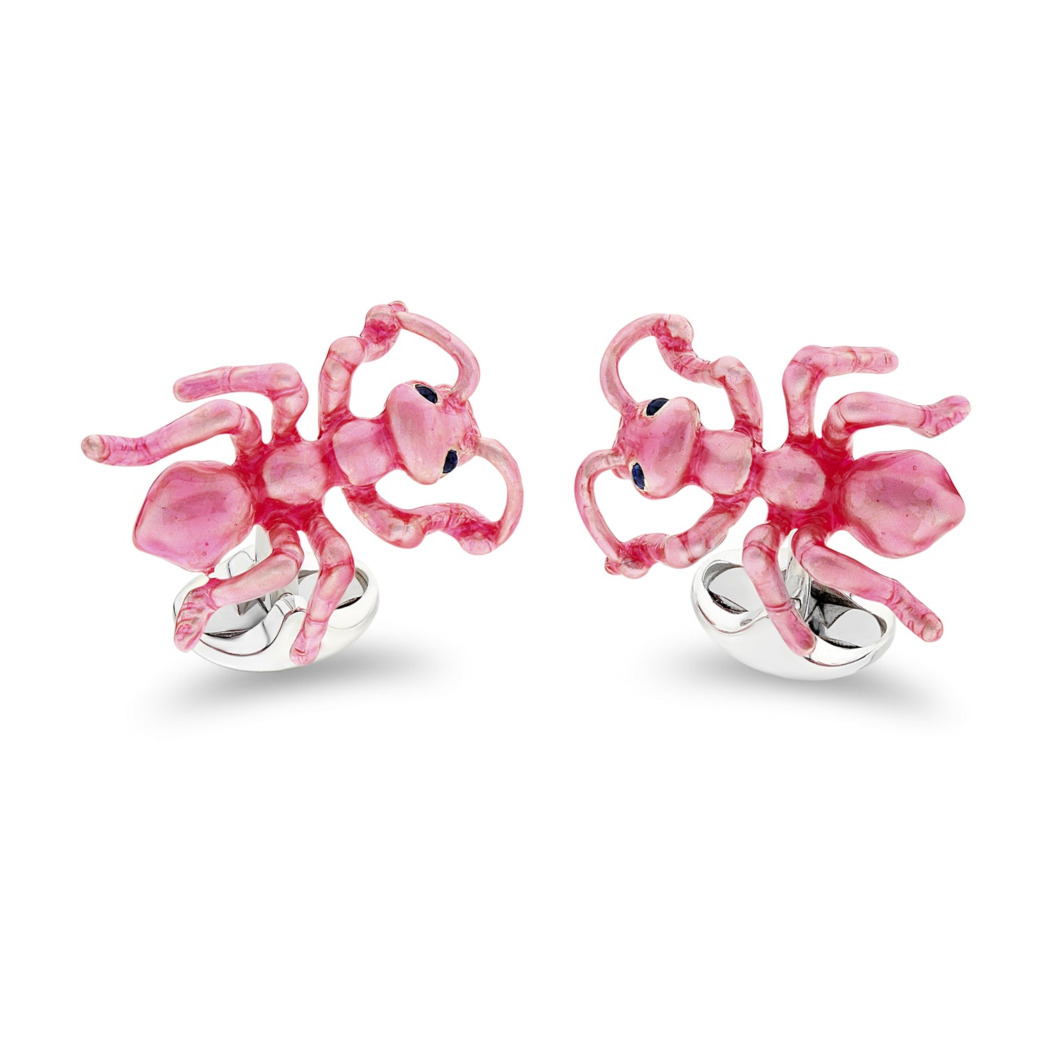 These fun and neon pink sterling silver ant cufflinks are a great way to brighten up your attire. Our queen ant also features bold blue cabochon sapphire eyes. Go bold with these quirky colourful cufflinks.