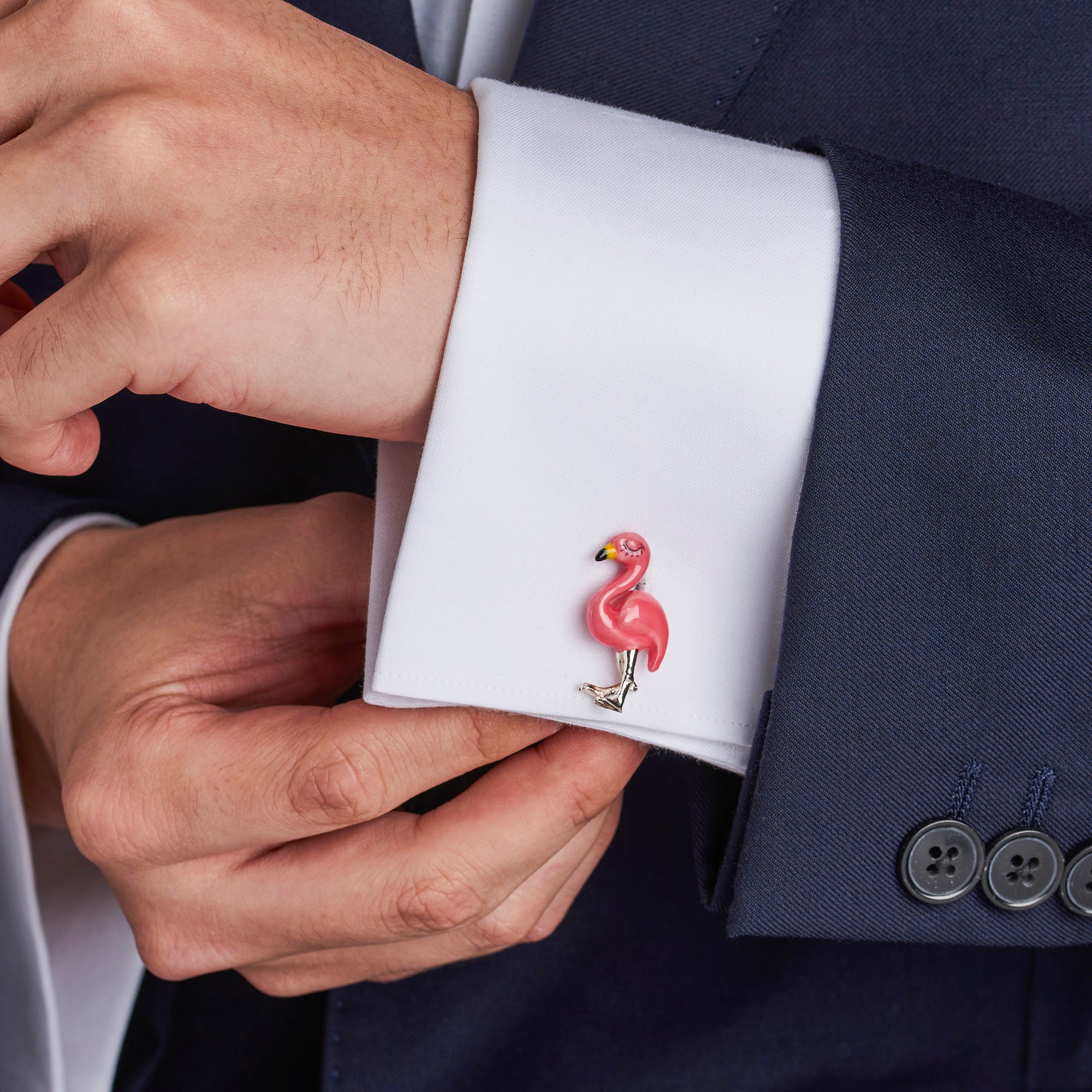 These sterling silver pink flamingo cufflinks will elegantly balance on your cuffs. Finished in a beautiful bright pink enamel these beautiful bird cufflinks are sure to be desired. Flamingos are known for their elegance and poise, making this pair the perfect accessory to your suit. Whether giving as a gift or treating yourself choose our engraving options to make these cufflinks more personal.